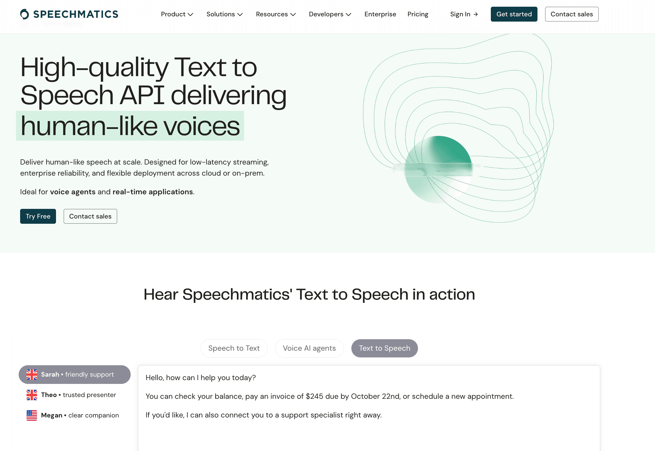 What they do: Speechmatics TTS currently supports English (US and UK) voices, with additional languages in active development for 2026. The system delivers first audio bytes in approximately 150 milliseconds via streaming APIs, designed specifically for real-time conversational applications. Voice quality is natural and clear, optimized for intelligibility rather than dramatic performance.